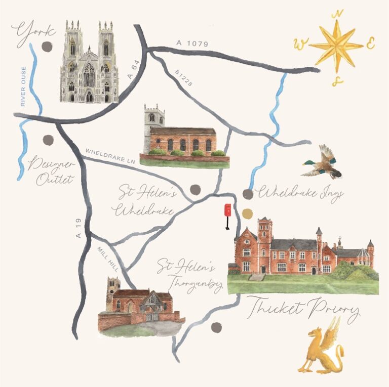 Follow the road from Wheldrake to Thorganby, after 1.5 miles you will see a red post box on your right. Opposite the red post box is the entrance to Thicket Priory.